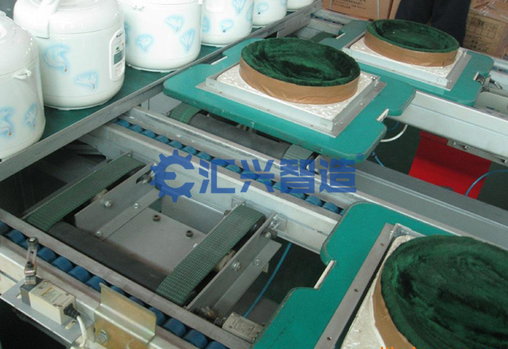 匯興智造電飯煲整廠自動化生產線是由各式差速鏈裝配檢測線、懸掛輸送裝配線、輥道輸送裝配線、鏈板式電機浸漆線、電飯煲測試檢測線組成,另外包括自動噴涂設備、頂升平移機、打包機等各類專機設備,共同完成電飯煲的生產任務。