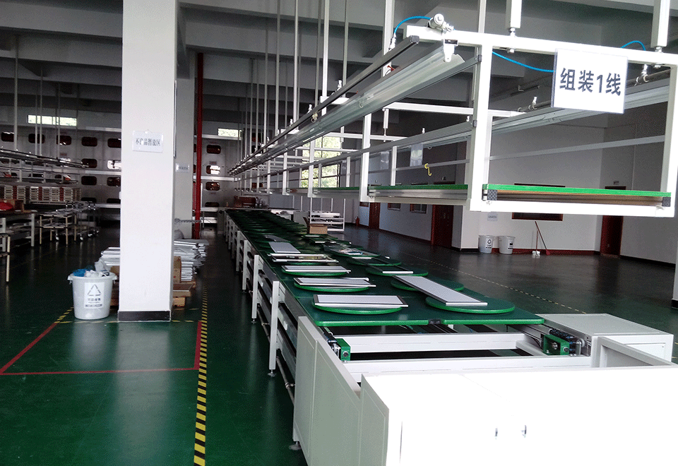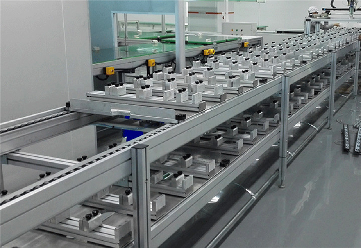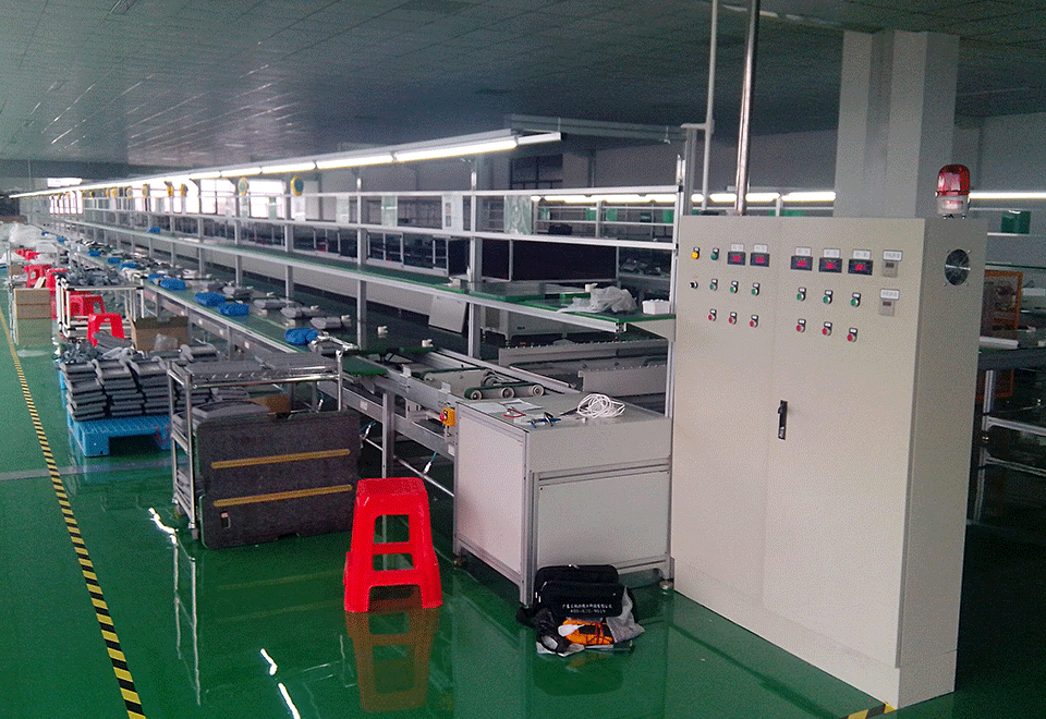來料測試線機架腳架采用優質方通組焊制作,每2米一段,采用鍍鋅可調腳杯;線體皮帶護邊采用方管制作,沿線體兩側一路布置;承載采用鍍鋅滾筒,中心間距200㎜安裝一條,全線布置;輸送帶采用綠色PVC防靜電皮帶,厚2mm、寬500mm無縫熱縮接駁,皮帶面低于機身護邊8㎜;照明系統:采用優質方管組焊制作,選用40W單支帶罩T8電子節能支架,全線布置。工作臺: 配對面坐工作臺,優質木夾板制作,面貼綠色防靜電膠皮,半圓木條包邊。