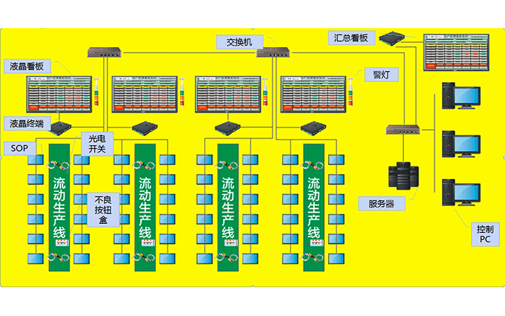 生產管理看板系統是指用于車間或生產線目視化管理(VM,Visual Management)的一種表現形式,即對數據、生產狀態等的情況一目了然地表現,主要是對于生產進度、生產狀態進行的透明化管理設備。電子看板則通過利用形象直觀而又色彩適宜的各種視覺感知信息來組織現場生產活動,了解實時的生產進度、產能、以及不良數等等。生產管理看板是發現問題、解決問題的非常有效且直觀的手段,是優異的現場管理必不可少的工具之一;它是6s的基本工具。