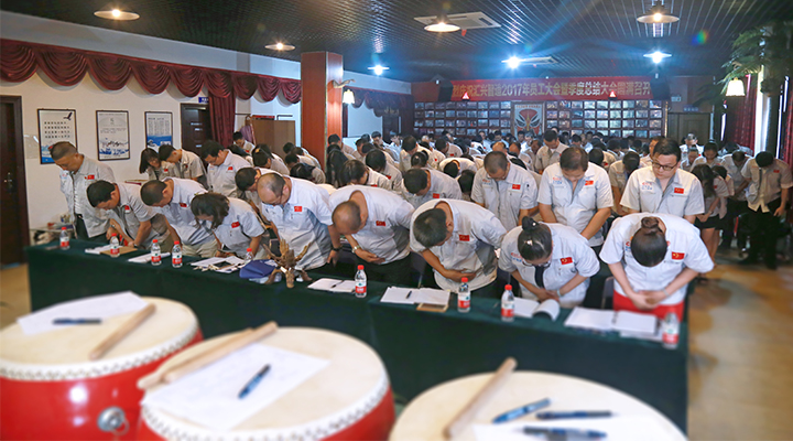 會議由行政部經(jīng)理袁侃主持。會議在激昂的《匯興之歌——用心智造世界》 拉開帷幕,全體參會人員向企業(yè)核心價值觀“孝道、商道、人道”行三鞠躬禮,宣讀企業(yè)愿景——成為全球領(lǐng)先的整廠自動化系統(tǒng)解決方案提供商,企業(yè)使命——做受尊敬的好人、造受尊敬的產(chǎn)品、辦受尊敬的企業(yè)、建受尊敬的平臺,企業(yè)精神——用情做人、用心做事,團隊精神——忠誠團結(jié)、勤奮進取。隨后,匯興智造干部職員代表鐘建輝、彭大海,鄭建團共同敲響士氣鼓,鼓舞匯興智造牢記初心,砥礪前行。