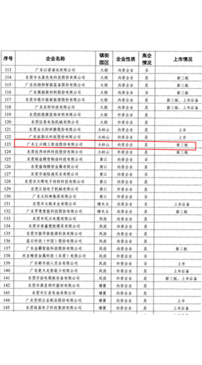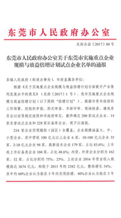 根據《關于實施重點企業規模與效益倍增計劃 全面提升產業集約發展水平的意見》(東府〔2017〕1號),以及《關于東莞市實施重點企業規模與效益倍增計劃試點企業名單的通報》(東府辦函〔2017〕80號),經過前期的書面申報、形式審查、書面評審、現場核查、專家評審、材料審計等規定流程和市政府審定,廣東匯興精工智造股份有限公司(股票代碼:839258)憑借17年來在智能裝備領域的核心科技以及高成長性,成功入選為東莞市實施重點企業規模與效益倍增計劃(以下簡稱“倍增計劃”)200家試點企業之一。