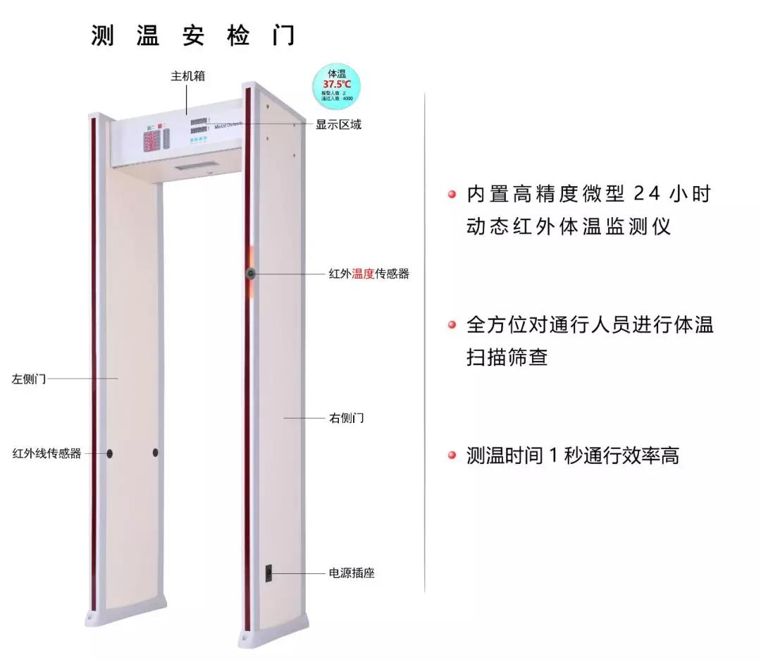 匯興智造人體測溫安檢門將集紅外測溫和金屬檢測為一體化,可對通過安檢門的人員進行溫度測試,如若超過安全溫度閾值將聯動安檢門聲光報警,有效對人員進行篩查并建立首道防線。